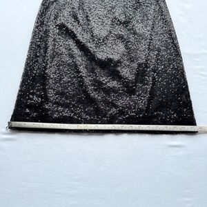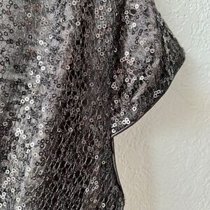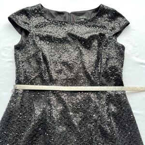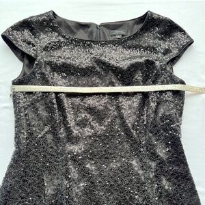 Tahari size 8 cap sleeve sequined black dress. Silky lining, small all over black sequins with rolled trim neck and arms. Back zipper, shoulder to hem: 38.5” see photos for additional measurements good preowned condition. No trades or modeling