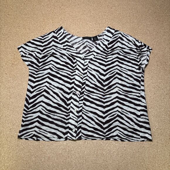 Tahari size M button front top 100% linen brown zebra print short sleeve A2