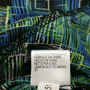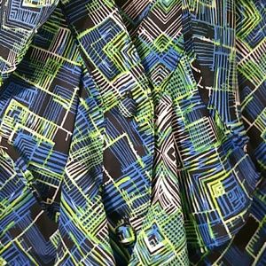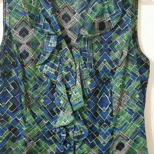 Tahari by Arthur S. Levine sleeveless ruffle front button down blouse. Size S. V neck. Fabric covered buttons with cascading ruffles. Green & blue geometric prints. Fitted blouse. Perfect summet office wear. No flaws.