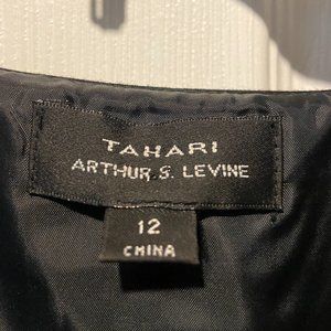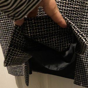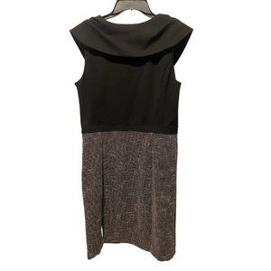 V-neck, sleeveless, overlap oversized wrap collar, black-top, attached black and white skirt with a tweed texture