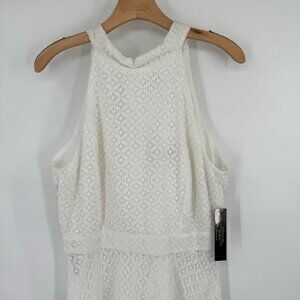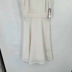 This brand new Tahari white eyelet sleeveless dress in size 10 is an epitome of elegance and sophistication. Made of premium quality cotton, the dress features a mock neck and a stylish tie.