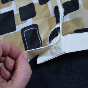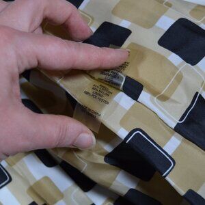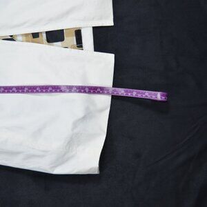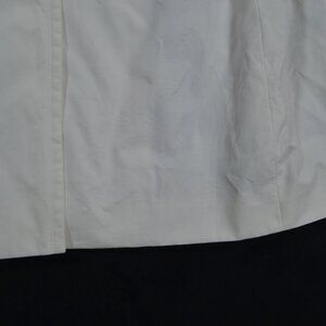 Elegant tahari water resistant trench coat in white features oversized lapel, pockets, shoulder pads, 3 button front closure with white enamel buttons, button sleeves with pointed cuffs, and back vent with original basting stitch still intact. Lining is intact and features a fun mod pattern. Very small discoloration on front (pictured) which will probably come out with a stain treatment. Machine wash, hang dry.