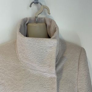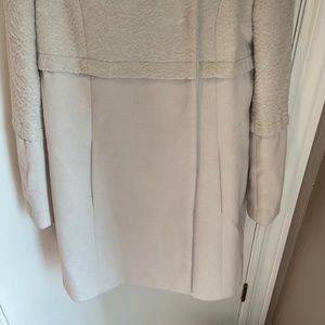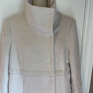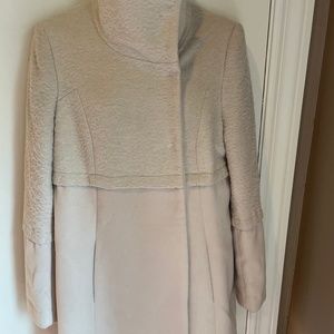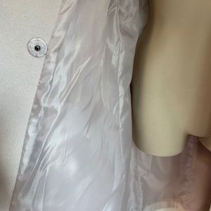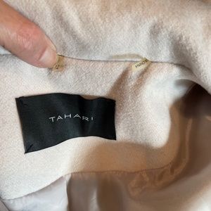 Tahari winter coat in a light beige. Size 12. This adorable coat will stand out in the bleakness of those winter days. Bodice is a patterned fabric along with 1/2 each sleeve; stand up collar that can be folded to the side; side pockets. fully lined. Closes with 5 large snaps Coat is in wonderful condition with no real signs of wear (some slight pilling) but you will probably want to dry clean it since its been in storage. Approximate measurements: armpit to armpit = 20" and length = 34.5"