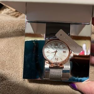 Brand new beautiful mesh style band mother of pearl face with copper color numbers and case comes with very nice Tahari box and tags