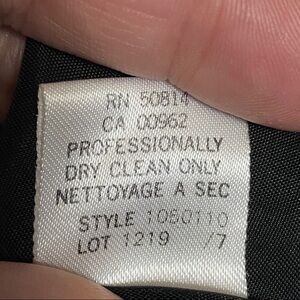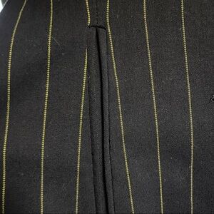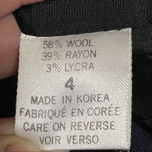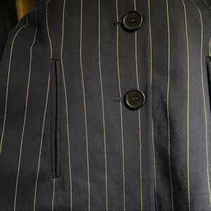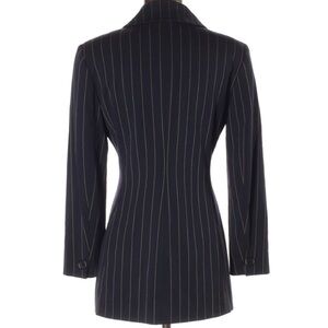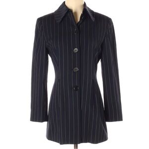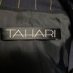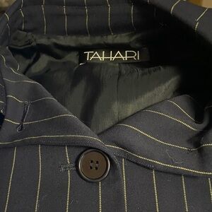 Tahari wool blend four-button jacket 4 #1050110. Beautiful tailored long blazer/suit jacket. Very versatile. Navy with stripes. Wool, Rayon, Lycra. Dry clean only.