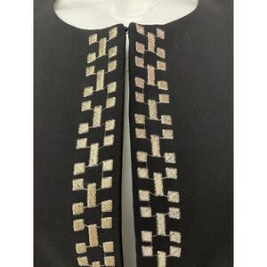 • Black blazer with metallic sliver trim at opening