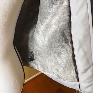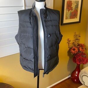 Quilted Faux Fur Lined Vest in Black. Zipper and button closure. Down filled. Material: 100% Polyester, 80% Acrylic, 20% Polyester. Fill 50% down, 50% Feather. Size: Large.