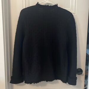 EUC- cotton blend, v-neck knit jacket, unlined, gold tone buttons, 2 front pockets with button closure, fringe around the edges.