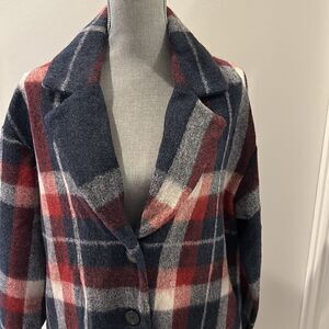 Beautiful Tahari wool blend sweater coat us red, white and navy blue. It has a frilled hemline. Collar, button down, with three buttons side pockets. Nice weight. Unlined. Underarm buttoned flat across is 22”. Length is 35” before frill. Sleeve length is 23”.