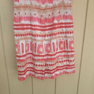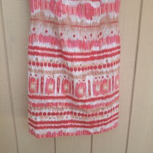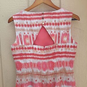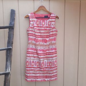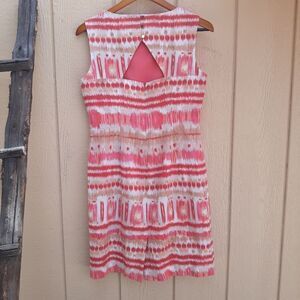 Linen blend coral, pink, tan and white Aztec print sleeveless scoop neck keyhole cutout back sheath dress by Tarhari Author S Levine. Gorgeous vibrant print dressy casual wear dress.