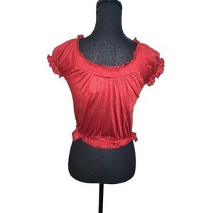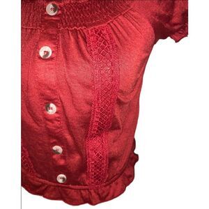 Maroon crew neck cropped top. Ruffled sleeves. Buttons as decoration. 55% polyester, 42% cotton, 3% spandex. Size: 8. Original price: $58.00. NWT.
