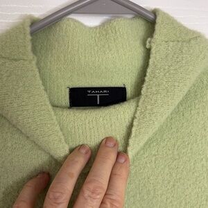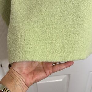 Fabulous sweater out of my personal closet in a smoke and pet free home. This sweater is so soft but still has structure. It is in a fuzzy nylon fabric. Notice the puffy sleeve design. It is in a soft baby green not as much like as some of the pictures make it look.