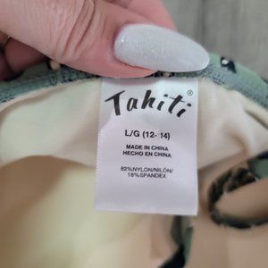 Step into summer with this Tahiti boho floral one-piece swimsuit. The tropical blue and tan design in size large (12-14) is perfect for pool parties and beach outings.