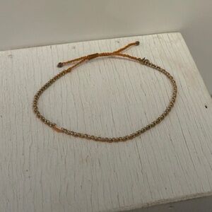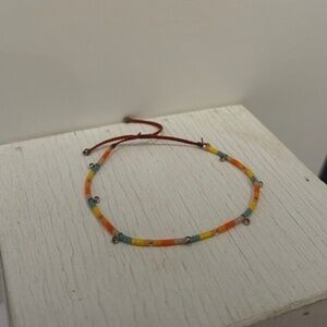 Beaded band with orange, yellow, and blue beads and dangling gold balls: