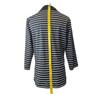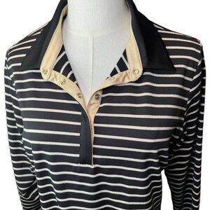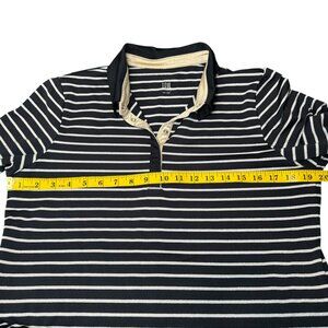 Elevate your casual wardrobe with this preowned Tail brand striped polo shirt in a timeless navy and white stripe pattern. Features include a sleek black collar, eye-catching gold snap buttons along a champagne satin placket, and 3/4 sleeves for a sporty yet polished look. The shirt measures approximately 26" in length and 19" across the chest (flat), making it a great fit for a size L. Crafted from a soft and stretchy performance fabric ideal for golf, tennis, or everyday wear.