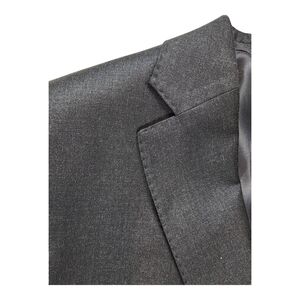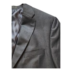 TailoRED union made men's blazer, crafted from luxurious REDA 1865 Super 130’s wool, a premium Italian fabric known for its exceptional quality, softness, and durability. This contemporary classic blazer is designed with a sleek, tailored fit that complements both formal and smart-casual looks. Charcoal gray with a refined sheen, it features a single-breasted silhouette with a sharp two-button closure, a classic notch lapel, and a single back vent for ease of movement. The blazer is fully lined with smooth black satin, accented with bold red stitching for a modern touch, and includes multiple interior pockets for functionality. The striped sleeve lining adds a subtle yet stylish detail, while finished with four marbled buttons, enhancing its refined look.