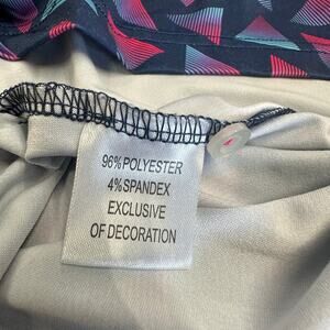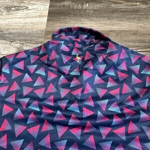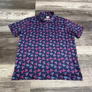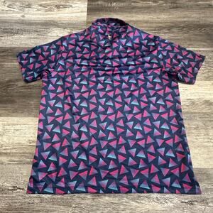 TailorByrd Navy Bue Purple Men XL Triangles Print Performance Golf Polo Shirt Wicking In excellent pre-owned condition, quick dry 3 button placket short Sleeve self collar stretch 96% Polyester, 4% Spandex performance preppy stretch golfer golf sporty sports athletic. geometric patterned abstract unique