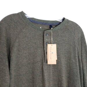 Tailor Vintage men's Henley long sleeved shirt, dark heather green/brown color, raglan sleeves, "fast dry" fabric. Classic men's casual shirt. Similar to Dexter style. Size Large. New with tags. Non-smoking home, pet friendly. Measures (flat) approx. 22.5" across the armpits, 21" armpit to end of sleeve, 27" shoulder to hem. *The model image for this item was AI-generated for illustrative purposes and may show slight variations from the actual product. Please refer to photos of the actual item for accurate details.