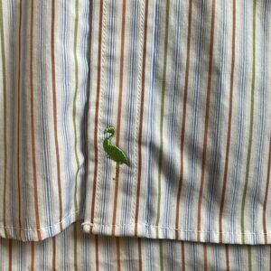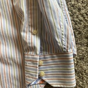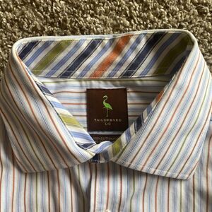 Mens TailorByrd White with Blue pin stripe and green and orange stripe accents. Accent color at collar and cuffs see photos. Excellent Condition. Size Large.