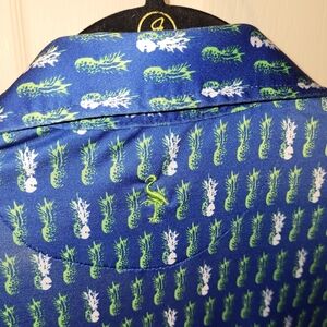 Stylish blue polo shirt with a unique pineapple pattern. Perfect for casual days or golf. SPF 30. Quick dry and moisture wicking fabric. Cool, smooth feel.