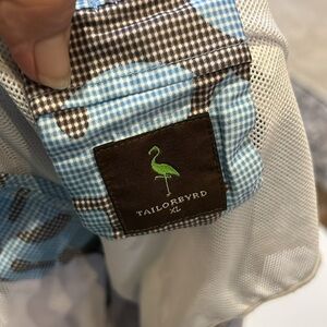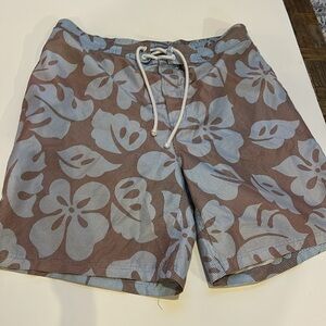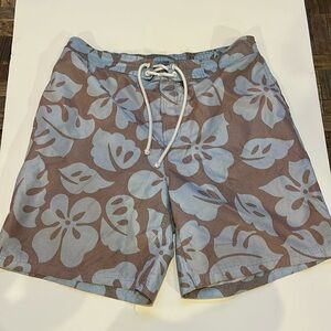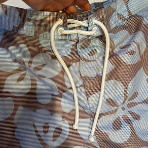 Tailorbyrd Men’s Swim Trunks. Blue & brown check & floral design. Back of waist is elastic. Back & front po let’s. Drawstring closure. Mesh netting, Measurements are approximate and taken laying flat: