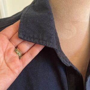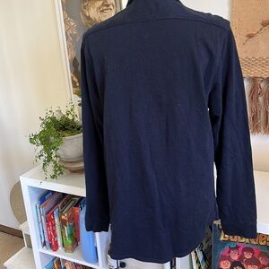 Cotton, more like a thick tee shirt material rather than traditional Oxford button up. Slight pattern, banded cuffs. Really cool, walks the perfect line between comfy/ casual and polished.