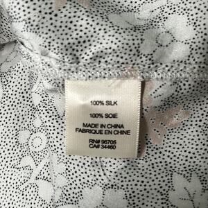 Details: Size 6, Silk, floral, tiny black polka dots, half buttons, elastic cuffs, great Preloved Condition