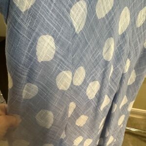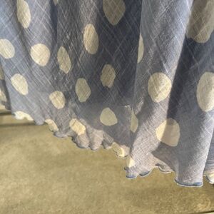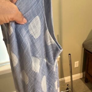Sleeveless, blue with white polka dots, lined with darts front and back, fantastic with white jean jacket or cardigan. tailoring makes for perfect flattering fit