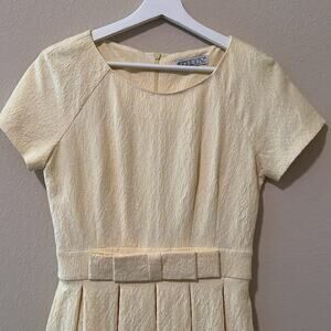 Tailored pleated midi dress with short sleeves, it features a back zipper opening for added convenience, size 1, suitable for S/M. Approximate flat waist measurement is 13 inches, and the flat pit-to-pit measurement is approximately 17 inches. The overall length is 39 inches. The dress has been worn only a few times and is in excellent condition. All items are from a smoke-free and pet-free home.