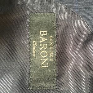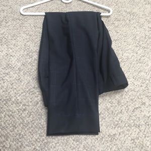Dark navy with windowpane patterning. The jacket and the pants have both been tailored, so it'll fit more like a 34S and a 28x30. 100% Super 150'S Wool. Two button. Double vented. Made in Italy. Fully lined. Pick stitching. Dry clean only! This suit is fabulous quality and hasn't steered me wrong at all, it's just time to move forward and I think you fashionable folks might find the perfect home for it. Feel free to ask questions or request any pictures!