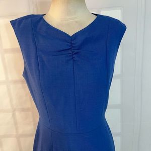Fun flirty and feminine sleeveless classic cut sheath dress in a soft medium shade blue ruched neckline business professional sheath dress