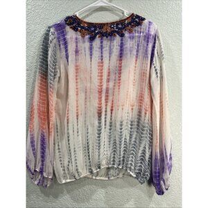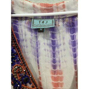 Taj Sabrina Crippa Silk Blouse Sz M White Hand Beaded Tie Dyed Resort Boho Tropical