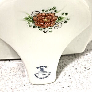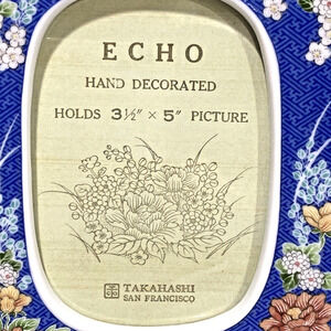 Takahashi ECHO Porcelain Easel Style Photo Frame / Picture Holder - with an oval shaped opening this frame is designed to hold a 3.5" X 5" photograph that loads from the top. Clearly hallmarked - dated 1980 - made by Takahashi San Francisco. White porcelain with an ornate multicolor Asian inspired floral motif on the front of the frame. In excellent vintage condition - original plastic cover is in place - minor shelf wear on the base - no damage or flaws - absolutely charming!