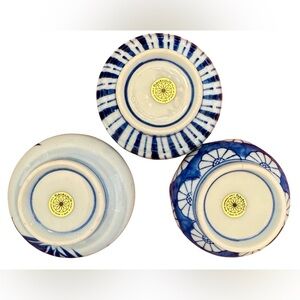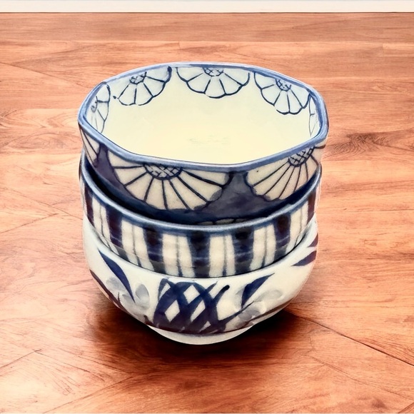 Absolutely stunning mid-century Takahashi Japanese blue and white ceramic porcelain teacups with differing designs. Two are round and one is octagonal at the top rim. Each approximately 3.25 x 1.75”. Bottom Stickers: Takahashi, Made in Japan, San Francisco 94103. Perfect for serving or display.