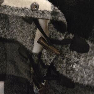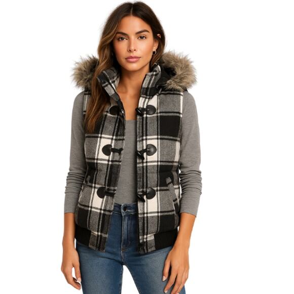 Keywords: Takara buffalo plaid vest, faux fur hooded vest, black and white winter vest, detachable hood coat vest, women’s checkered outerwear, NWT size small vest, cozy cold-weather fashion, plaid zip-up vest.