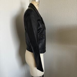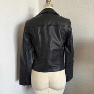 Super fun P.U. or vegan leather biker style jacket perfect for chilly autumn days.