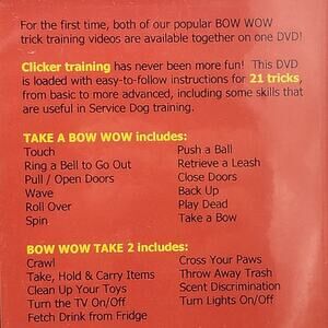 The product is a DVD titled "Take a Bow Wow! and Bow Wow Take 2," focusing on dog trick training. Presented in English, the DVD features various tricks and training exercises for canines, designed to entertain and educate owners on how to train their dogs in fun and interactive ways. With a not rated designation, this DVD is ideal for dog owners looking to enhance their bond with their furry companions through playful and engaging training sessions.