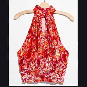 Pretty and pleated, this timeless halter top is featured in a bold, printed velvet fabrication with defined bottom hem and keyhole closure at back for classic style no matter the season.