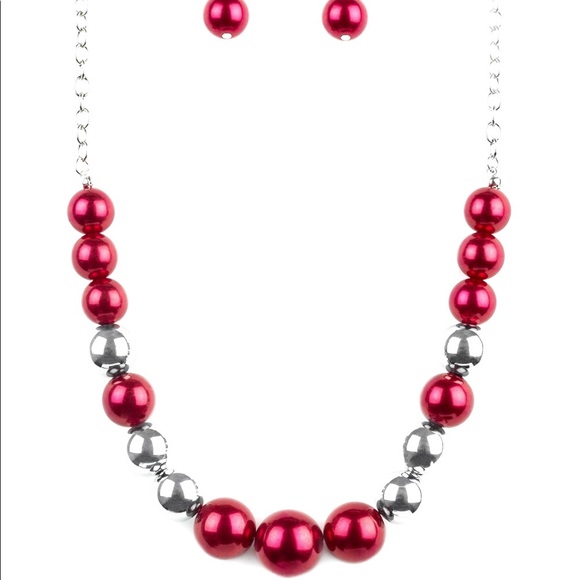 A collection of oversized silver and pearly red beads drape across the chest for a refined look. Features an adjustable clasp closure.