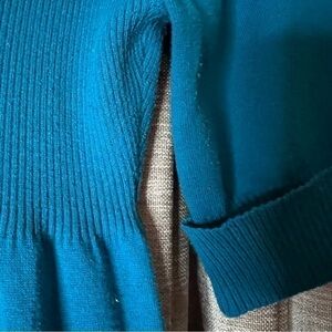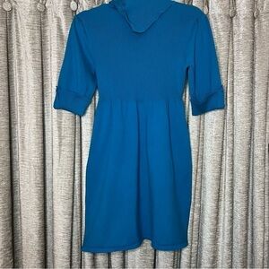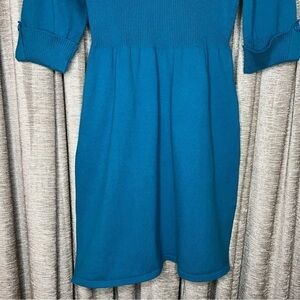 Take Out turquoise turtleneck button accent sweater dress with elbow length sleeves and fit and flare style. Mini dress material as shown in photos. Size large.