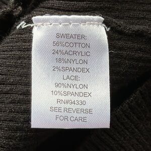Take Out black V-neck button down cardigan with lace back detail, size S. Good preowned condition. See fabric content on label photo. Four large front buttons. Super cute!