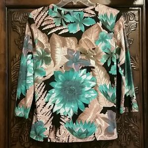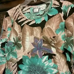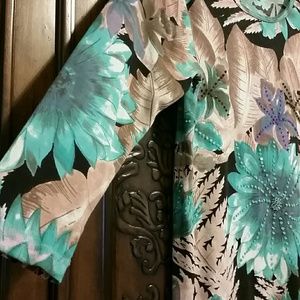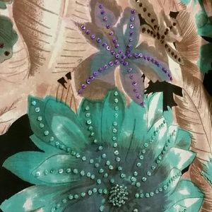 Soft stretchy 100% cotton with beads and sequins. 24 inches long, sleeves 19 inches. Peach, beige, teal, black, purple and white. New, never worn.
