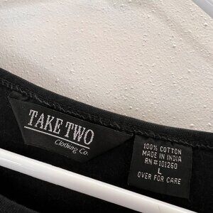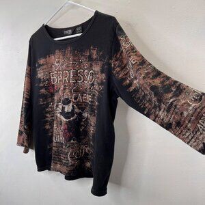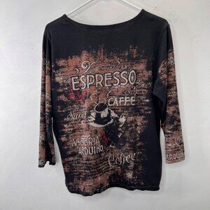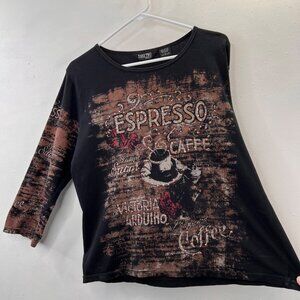 Take Two Clothing Co Espresso Cafe shirt in black and tan. Sequins, all over design, good condition. Size L.