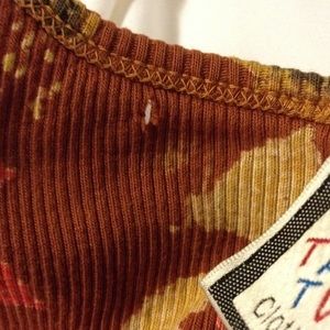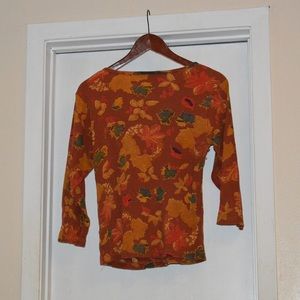 Fall print 3/4 sleeve ribbed t-shirt. Has scattered beading. (A few of the beads are missing but not noticeable) Small pin hole on back near the tag. Shown in last pic.