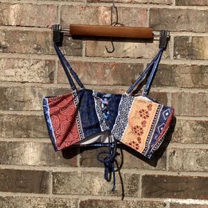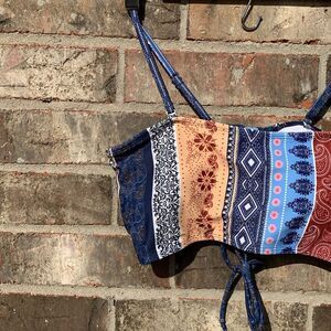 Boho patchwork crop top with adjustable straps. Features a mix of blue, red, and tan patterns.