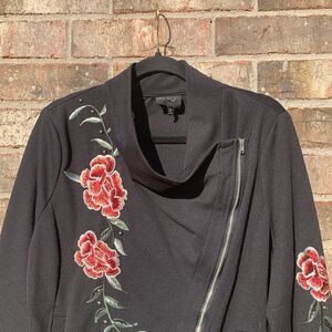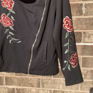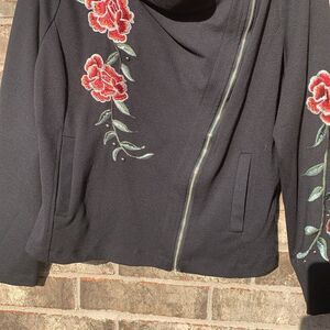 Stylish black jacket with striking red floral embroidery. Asymmetrical zipper adds modern flair.