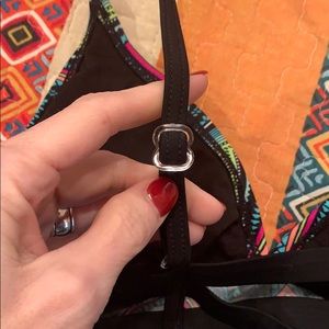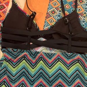Bright colorful takini with 3 strap detail across the back. Both straps are adjustable
