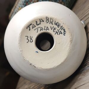 Vintage Talavera Pottery Hand Painted Floral Candle Holder with Handle. This signed and numbered pottery piece has a cream colored matte glaze painted with blue, green, yellow, and orange lines and florals. The handle adds charm to this colorful candle holder.