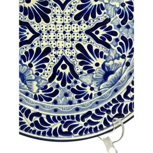 This beautiful Talavera charger plate is a stunning example of traditional Mexican pottery. Handcrafted and signed in Puebla, Mexico, this plate is in excellent condition, measures 1.25"H x 12" in diameter and features a bold, vibrant cobalt blue and white kaleidoscope type design. Perfect for display or adding a touch of Mexican artistry to your home, add a touch of elegance and cultural flair to your home decor with this exquisite Talavera piece today! Additional plates of similar design are available in our store if you'd like multiple plates. # 5112