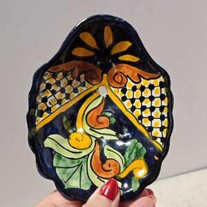Hand painted Talavera Ramirez Mexican pottery soap dish in vibrant colors.